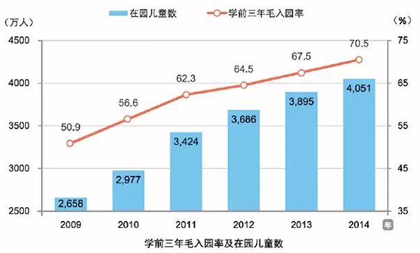 2014年,学前三年毛入园率达到70.5%,比2009年的50.9%提高了19.6个百分点,提前6年实现《规划纲要》确定的2020年的发展目标,有效缓解了“入园难”问题。
